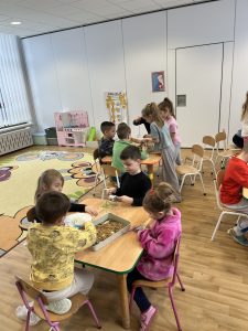 Grupa „Lisków” z zaangażowaniem i radością przygotowywała pokarm dla ptaszków. Dzieci wykorzystały rolki po papierze, które posmarowały smalcem, a następnie obtoczyły w ziarenkach. W ten sposób powstały naturalne karmniki, które pomogą dokarmiać ptaki w chłodniejsze dni.