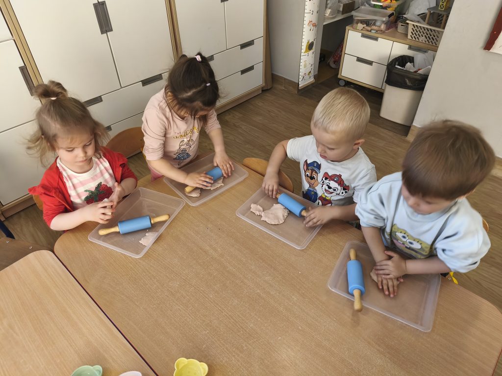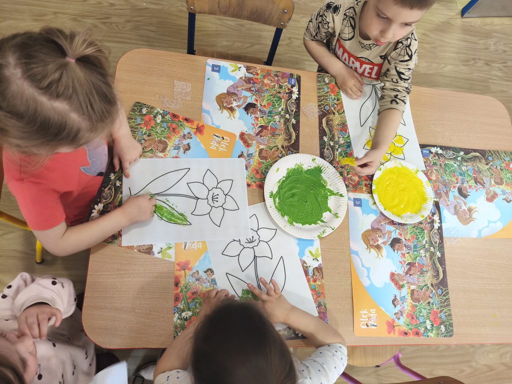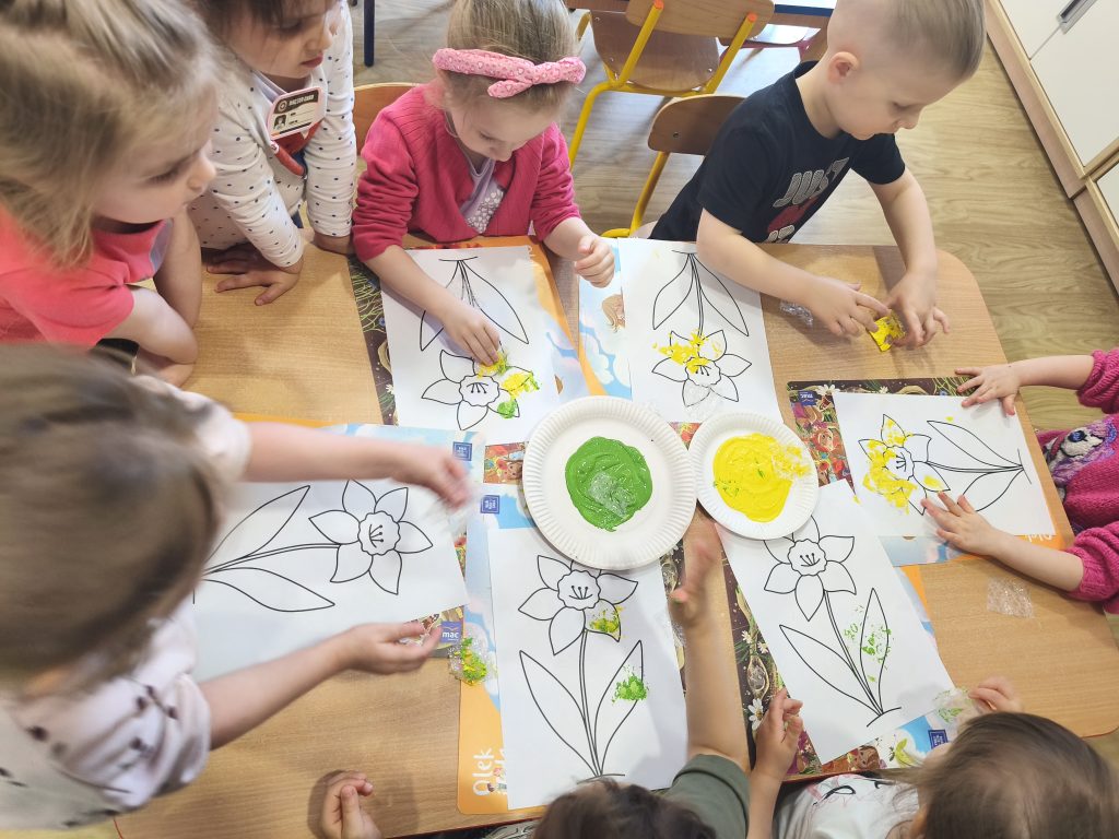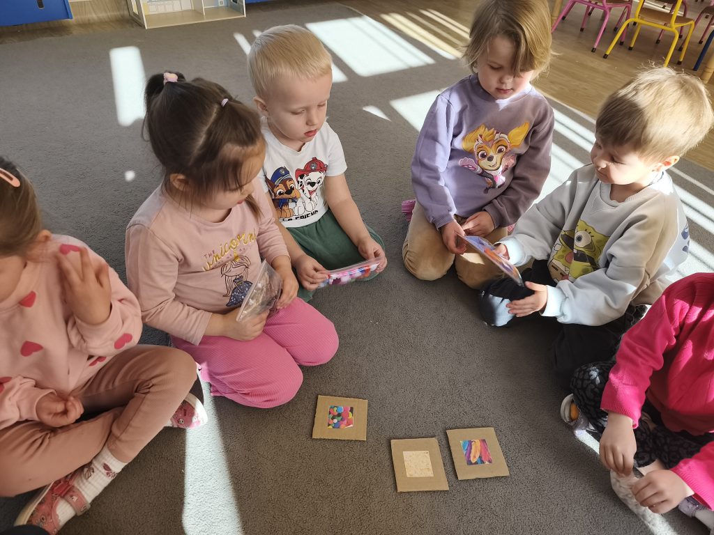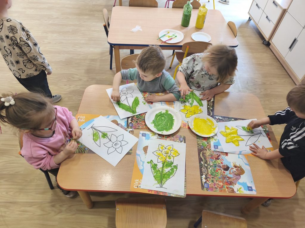 W tym tygodniu ukadaliśmy wiosenne kwiaty z darów Froebla, malowaliśmy- stemplowaliśmy folią bąbelkową oraz ćwiczyliśmy rączki poprzez zabawy sensoryczne z różnymi fakturami oraz wykonaliśmy domową ciastolinę.
