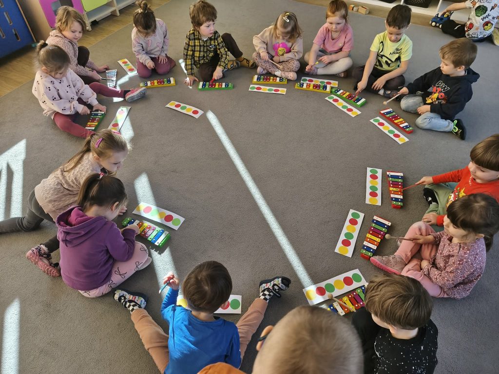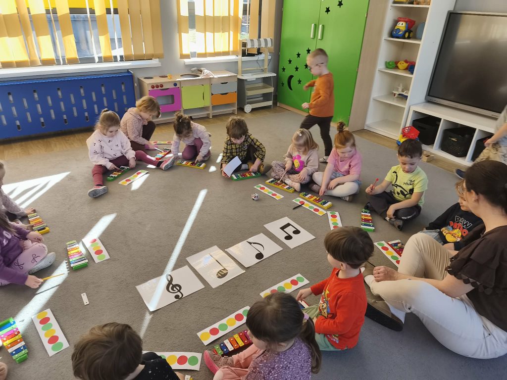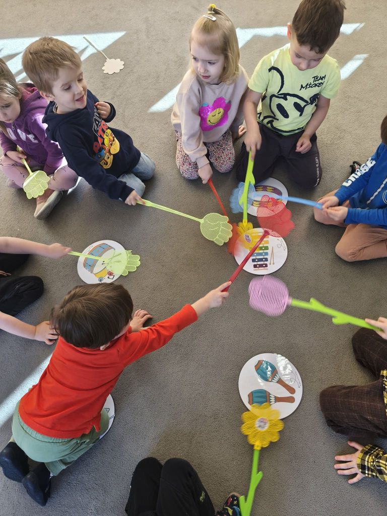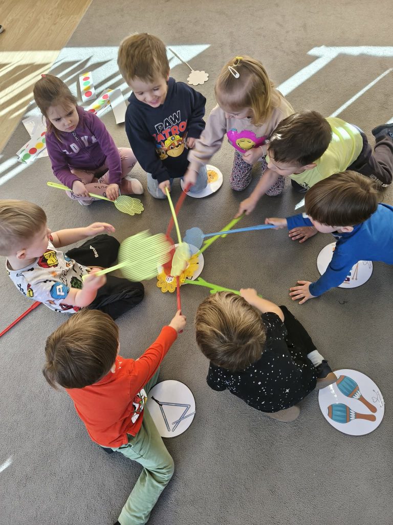 Dzieci uczestniczyły w zabawach muzycznych z instrumentami. Podczas zajęć miały okazję poznać brzmienie takich instrumentów jak tamburyn, cymbałki, bębenek czy trójkąt. Mogły zagrać również własną melodię.